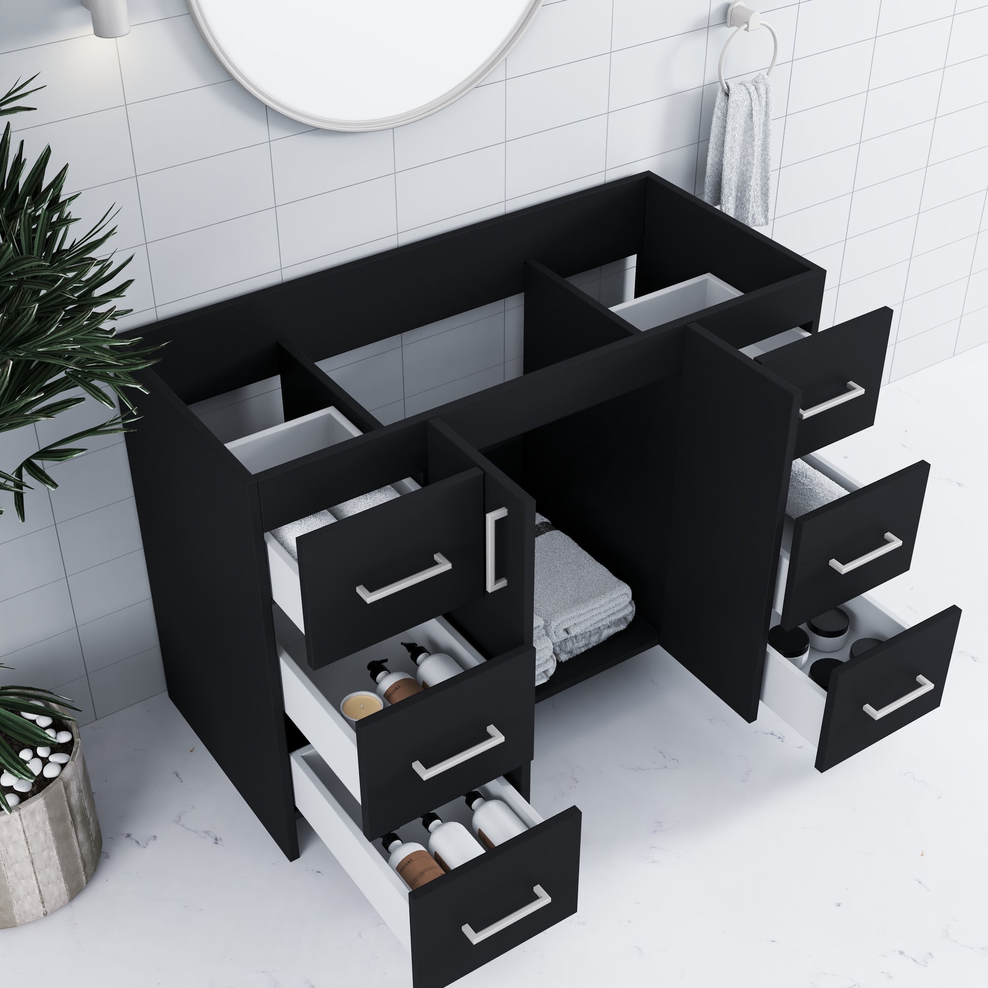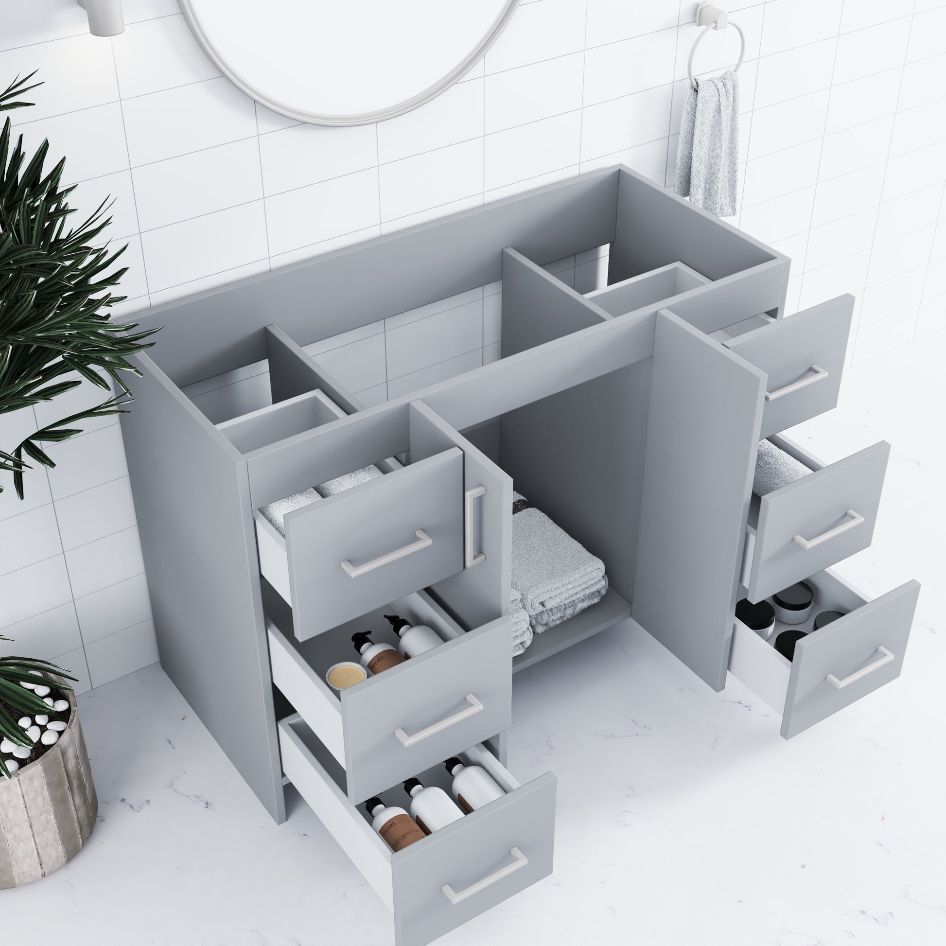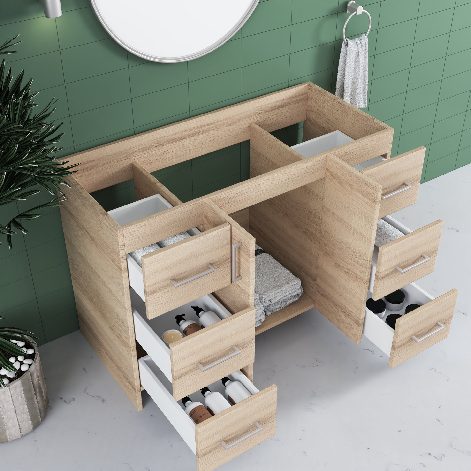 - Silent Operation Drawers: Soft-closing feature for a tranquil, luxurious bathroom experience.